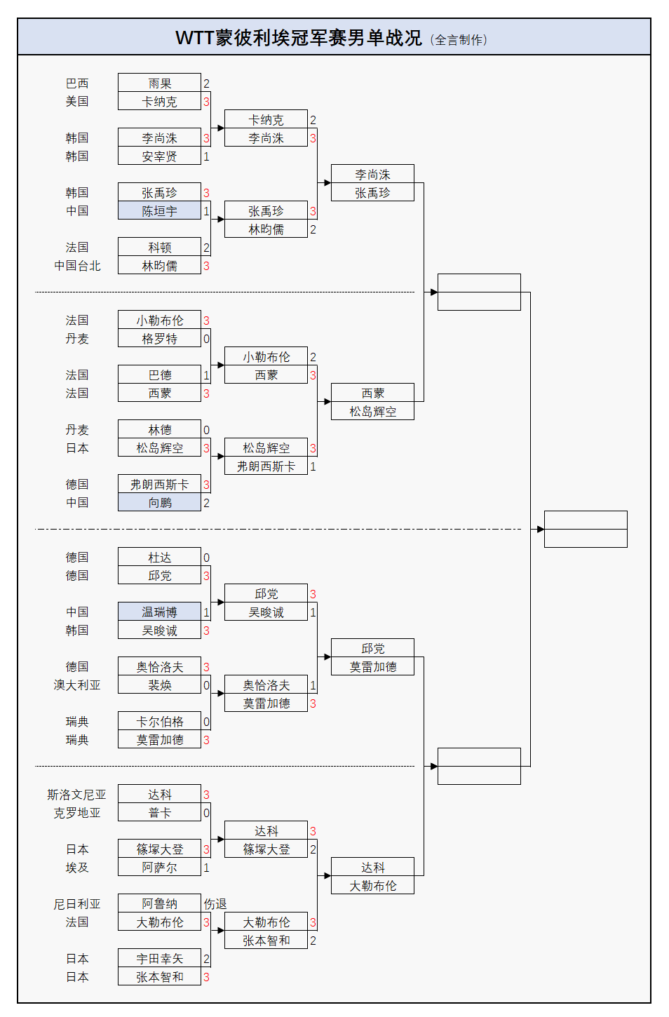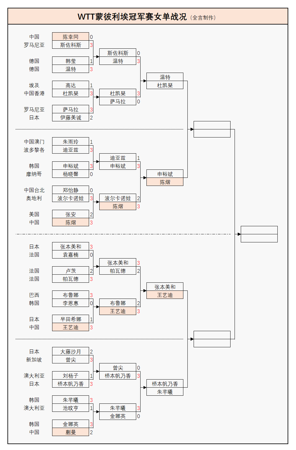 目前男单前八号种子当中的6人(雨果、张本智和、小勒布伦、杜达、向鹏、林昀儒)已经出局,仅剩莫雷加德、达科;女单前八号种子当中的5人(陈幸同、蒯曼、朱雨玲、伊藤美诚、大藤沙月)也没能挺过前两轮,剩王艺迪、张本美和、陈熠——详细战况如下: