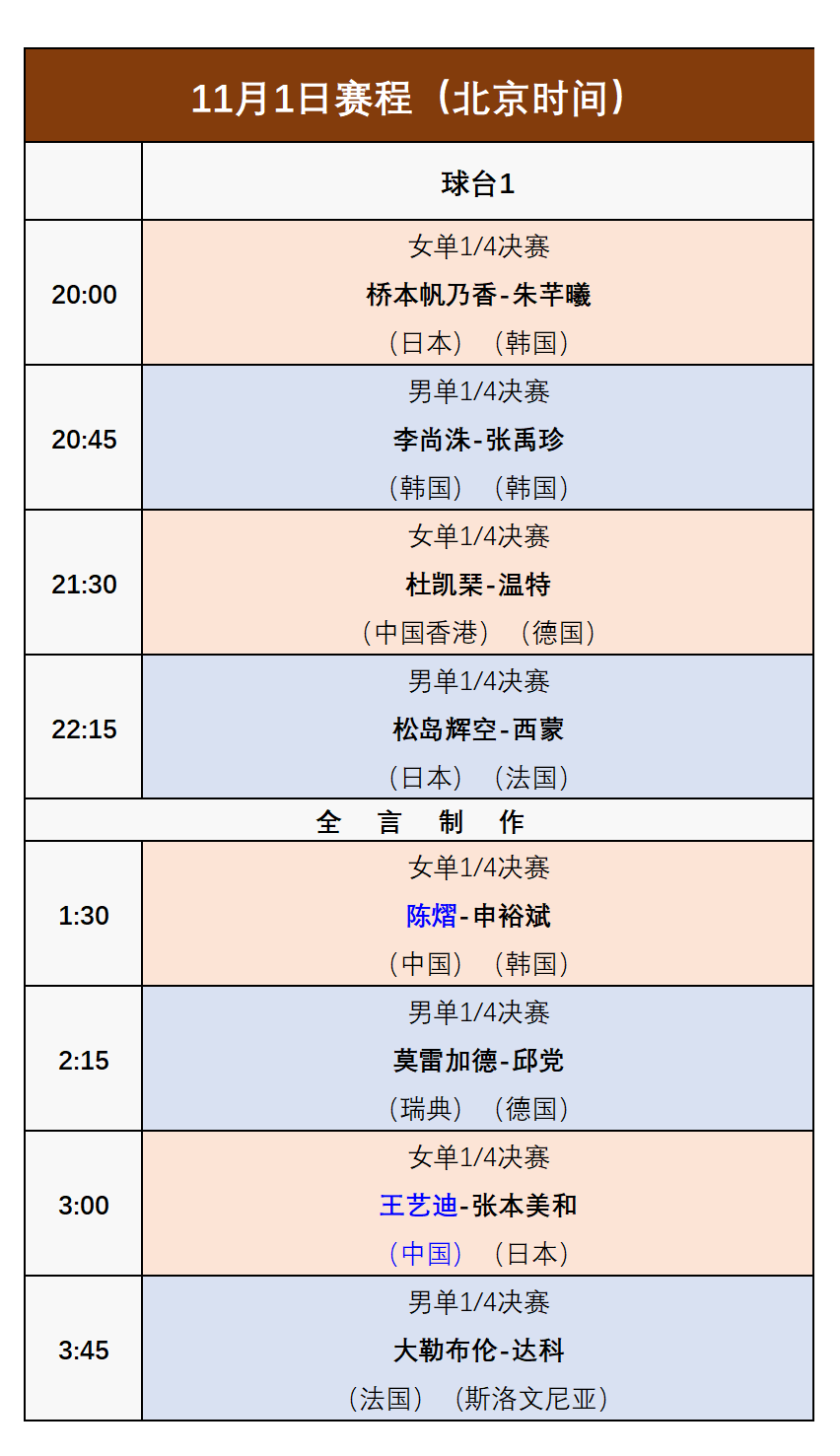 紧接着北京时间11月2日凌晨将结束剩下的4场单打1/4决赛,国乒运动员也将亮相,详细安排为: